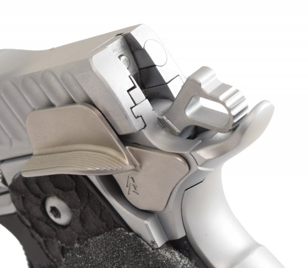 The extended Safety paddle on the left side rests on top of the plunger tube, preventing excessive pressure and strain on the pin. The shields are well spaced away from the slide to avoid any contact or rub marks, which are common with other shielded Safeties.