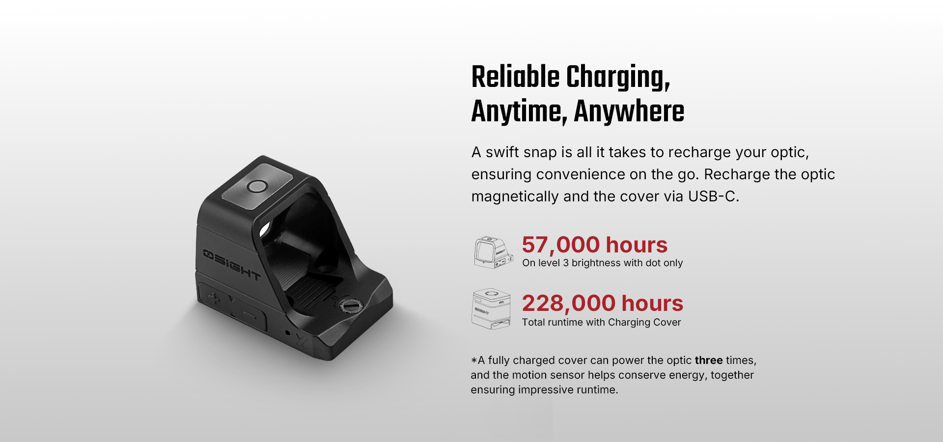 • Industryʼs First Magnetic Charging Cover: The Osight X boasts a pioneering Magnetic Charging Cover featuring a battery display that reveals the real-time battery levels for both the cover and the optic, making uncertainty certain.